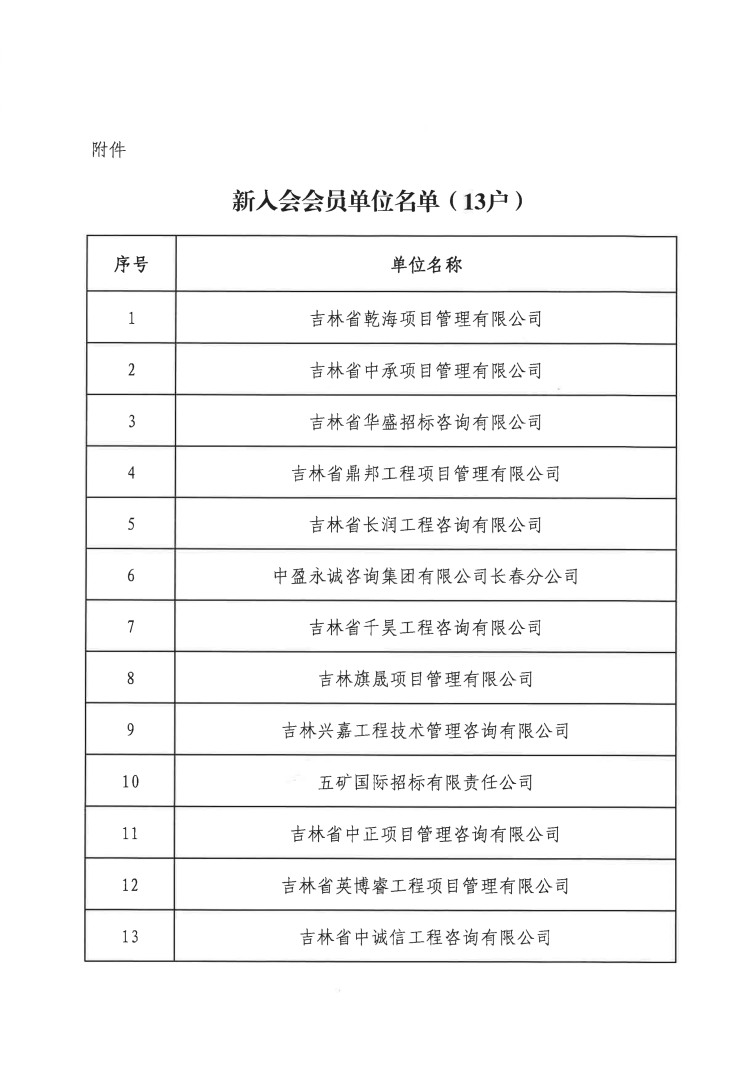 吉林省建設(shè)工程招標(biāo)投標(biāo)協(xié)會關(guān)于接納吉林省乾海項目管理有限公司等13戶企業(yè)為會員單位的通知