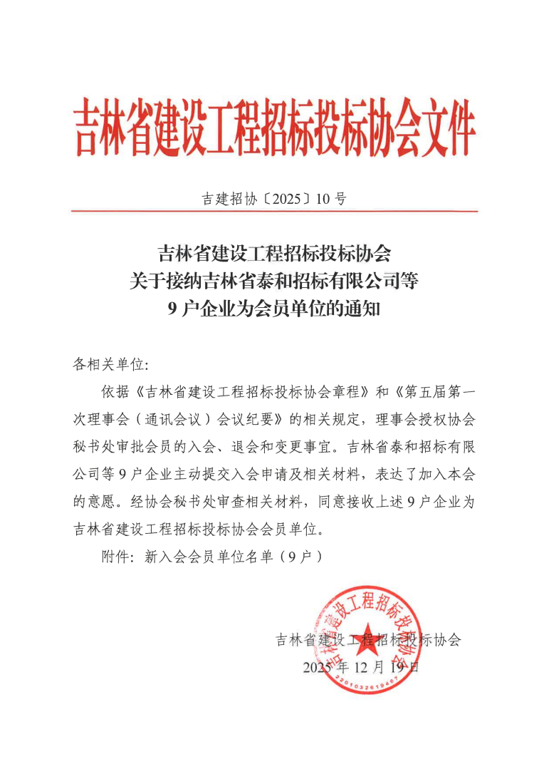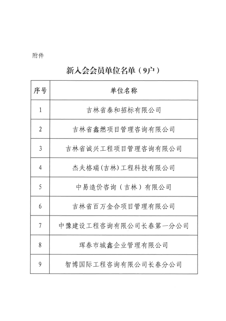 吉林省建設(shè)工程招標投標協(xié)會關(guān)于接納吉林省泰和招標有限公司等9戶企業(yè)為會員單位的通知