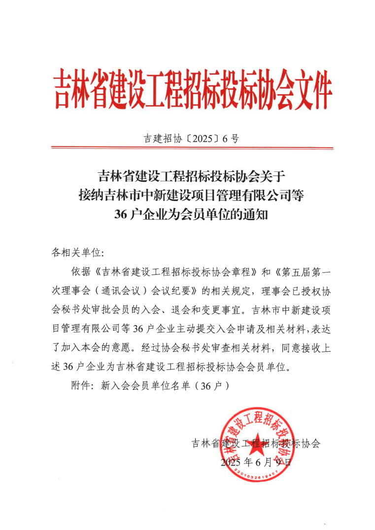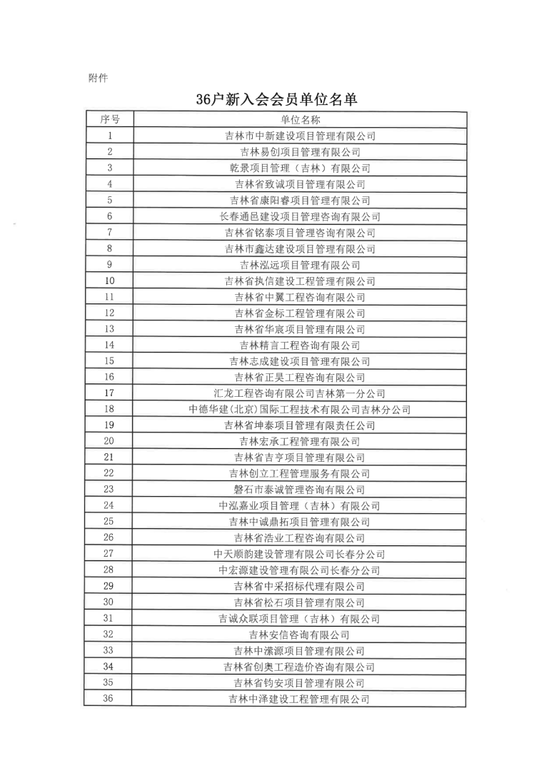 吉林省建設(shè)工程招標(biāo)投標(biāo)協(xié)會(huì)關(guān)于接納吉林市中新建設(shè)項(xiàng)目管理有限公司等36戶企業(yè)為會(huì)員單位的通知