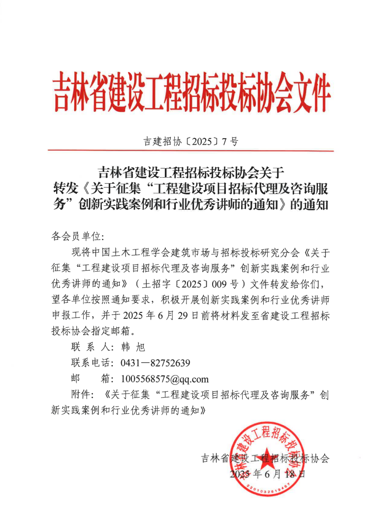 吉林省建設(shè)工程招標投標協(xié)會關(guān)于轉(zhuǎn)發(fā)《關(guān)于征集“工程建設(shè)項目招標代理及咨詢服務(wù)”創(chuàng)新實踐案例和行業(yè)優(yōu)秀講師的通知》的通知