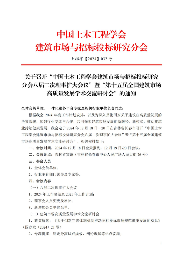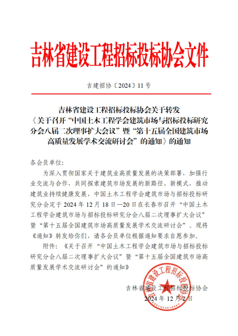 吉林省建設工程招標投標協(xié)會關于轉發(fā)《關于召開“中國土木工程學會建筑市場與招標投標研究分會八屆二次理事擴大會議”暨“第十五屆全國建筑市場高質(zhì)量發(fā)展學術交流研討會”的通知》的通知