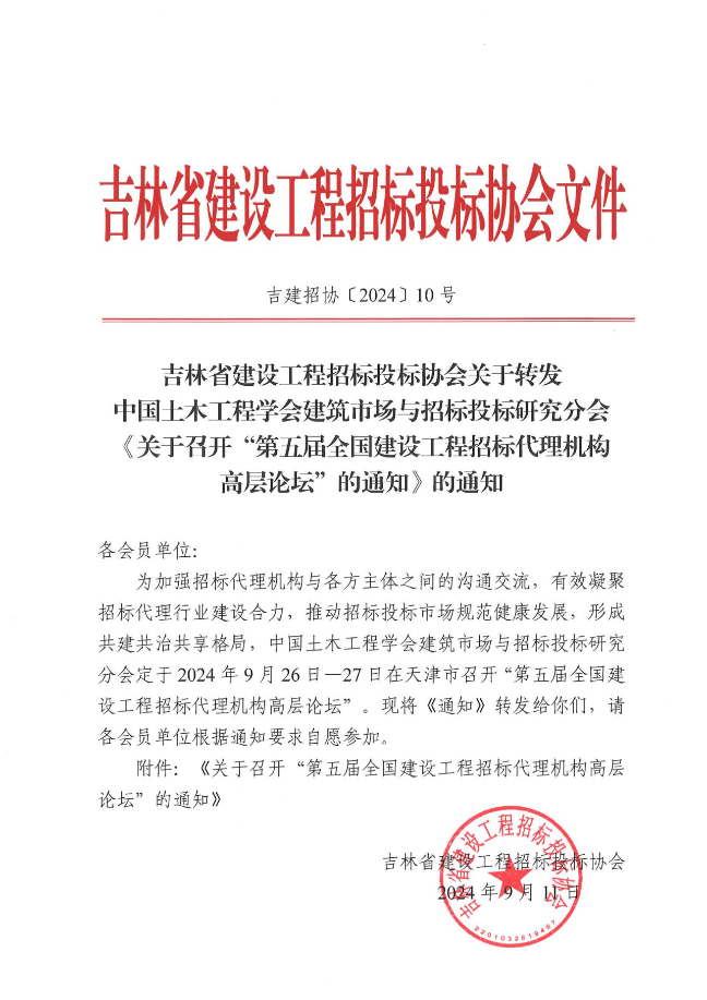 吉林省建設(shè)工程招標(biāo)投標(biāo)協(xié)會(huì)關(guān)于轉(zhuǎn)發(fā)中國土木工程學(xué)會(huì)建筑市場與招標(biāo)投標(biāo)研究分會(huì)《關(guān)于召開“第五屆全國建設(shè)工程招標(biāo)代理機(jī)構(gòu)高層論壇”的通知》的通知