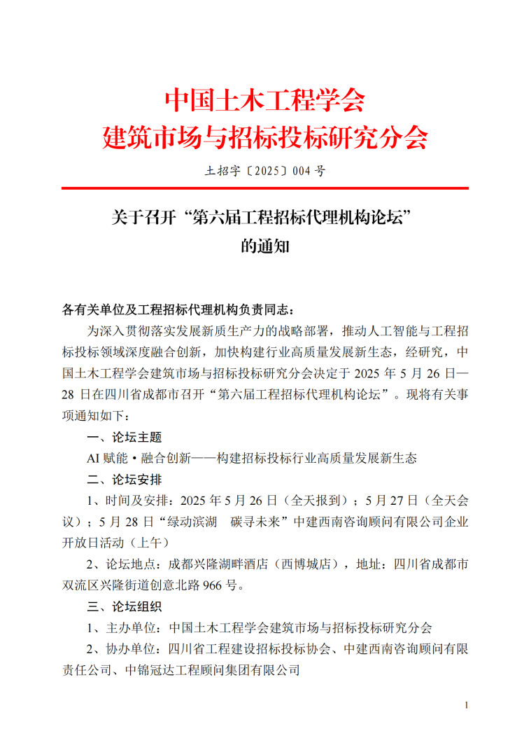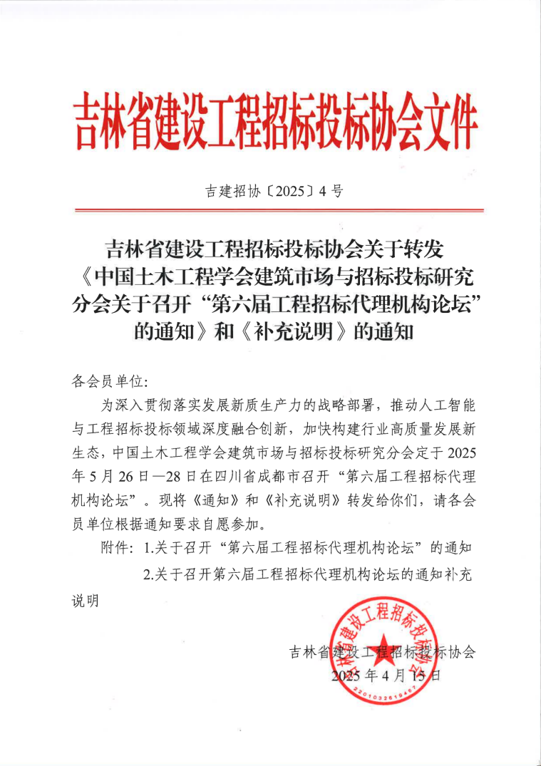 吉林省建設(shè)工程招標(biāo)投標(biāo)協(xié)會(huì)關(guān)于轉(zhuǎn)發(fā)《中國土木工程學(xué)會(huì)建筑市場與招標(biāo)投標(biāo)研究分會(huì)關(guān)于召開“第六屆工程招標(biāo)代理機(jī)構(gòu)論壇”的通知》和《補(bǔ)充說明》的通知